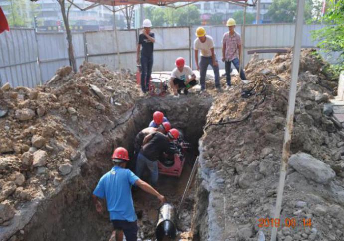 8月9日下午,水廠反映供水量有增大跡象,疑似有漏點(diǎn),經(jīng)測(cè)漏人員對(duì)城區(qū)可疑地點(diǎn)進(jìn)行排查,在市政府轉(zhuǎn)盤處一國(guó)防光纜井內(nèi)發(fā)現(xiàn)漏水點(diǎn),為DN400mm主管道漏水。確認(rèn)漏點(diǎn)后,搶修人員立即組織開(kāi)展搶修工作,由于漏水點(diǎn)處于交通要道,車流量大,旁邊有國(guó)防光纜這一重要設(shè)施,路面水泥層厚近1米,管道深度達(dá)2.7米,施工難度大,需要大型機(jī)械開(kāi)挖。在聯(lián)系機(jī)械和國(guó)防光纜工作人員的同時(shí),搶修人員立即在開(kāi)挖區(qū)域設(shè)置圍擋、安全警示牌,配備搶修材料。為防止供水管道和國(guó)防光纜在開(kāi)挖過(guò)程中被損壞,只有依靠人工挖出一定深度確認(rèn)安全后,挖機(jī)才能繼續(xù)工作。開(kāi)挖完成后,由于閥門關(guān)閉不嚴(yán)、導(dǎo)致余水量較大,考慮到停水將給用戶帶來(lái)不便,搶修人員決定帶水作業(yè),不顧噴涌而出的水花和四處飛濺的泥漿,他們一頭扎進(jìn)工作坑中,奮力搶修。在高溫灼熱、蚊蟲(chóng)環(huán)繞的環(huán)境里,大家齊心協(xié)力、連續(xù)奮戰(zhàn)13個(gè)小時(shí),終于將DN400mm鑄鐵管的兩個(gè)漏水點(diǎn)處理完畢,比預(yù)計(jì)恢復(fù)供水時(shí)間提前了5小時(shí),圓滿完成了搶修任務(wù)。